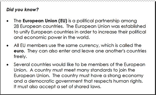 An effective instructional strategy would be a shared writing lesson that challenges students to describe a geography-related picture by using a single descriptive sentence. Students would brainstorm three or four descriptors of the picture, to be written in short sentences on the board. The teacher would then demonstrate how to combine those sentences into a single longer sentence, perhaps including instruction on conjunctions and punctuation. Next, the students would work in pairs using new pictures and a graphic organizer to guide them through three steps: (1) writing ideas, (2) writing short sentences, and (3) combining the short sentences into one. The pairs would work together to ultimately develop a single sentence for publishing on the bulletin board. This lesson will give the student writing about the EU a strategy for crafting smooth, effective sentences in the content areas, so instead of tacking on short descriptions, s/he could write, "[Countries] ... can increase their political and economic power, use the euro, and enter ... freely."