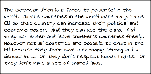 An area for improvement would be writing conventions. The student can produce complex sentences with subordinating conjunctions, but when it comes to adding details, s/he often resorts to tacking on short sentences beginning with conjunctions, e.g., "And they can use the euro. And they can enter ... freely." The student should learn how to incorporate a series of independent clauses with the same subject into a single sentence to avoid repetition and consolidate ideas within written sentences.