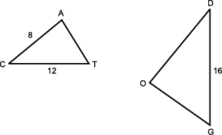 Two triangles first triangle A C T. Side A C is labeled eight. Side C T is the longest side and is labeled twelve. Second triangle O D G. Side D G is the longest side and is labeled sixteen.