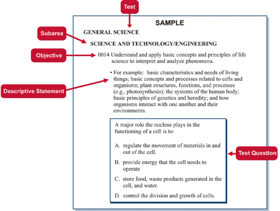 The title of the chart is Sample. The first line says General Science. A red callout indicates that this is the Test. The next line is indented one level and says Science and Technology/Engineering. A red callout indicates that this is the Subarea. Next is a paragraph that is indented two levels. It says 0014. Understand and apply basic concepts and principles of life science to interpret and analyze phenomena. The red callout indicates that this is the Objective. Next is a bulleted paragraph that is indented three levels. It says For example: basic characteristics and needs of living things; basic concepts and processes related to cells and organisms; plant structures, functions, and processes (e.g., photosynthesis); the systems of the human body; basic principles of genetics and heredity; and how organisms interact with one another and their environments. The red callout indicates that this is the Descriptive Statement. Next is a boxed question with responses, identified by the red callout as a Test Question. It reads: A major role the nucleus plays in the functioning of a cell is to: A. regulate the movement of materials in and out of the cell. B. provide energy that the cell needs to operate C. store food, waste products generated in the cell, and water. D. control the division and growth of cells.