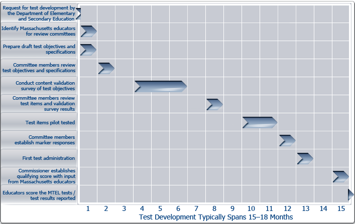 Test development for the MTEL is accomplished through the close collaboration of the Department, Evaluation Systems, and Massachusetts public school educators and college faculty. The contribution of Massachusetts educators is essential to the success and integrity of the MTEL program. Educators participate at every stage of test development by serving on review committees, responding to surveys, assisting in pilot test activities, and providing input used by the Massachusetts Commissioner of Elementary and Secondary Education in setting the qualifying (passing) score for the tests. In addition, educator candidates make a valuable contribution to the test development process by participating in the pilot testing of test items.
