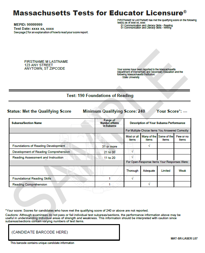 Familiarize yourself with the sample score reports below. Also review the Score Report Explanation page. You can use that information to help candidates who are retaking a test understand how to use their score report in making their study plan.