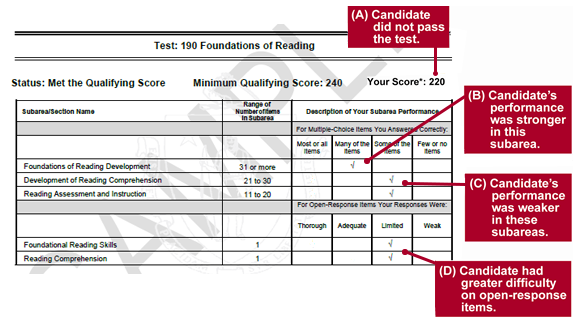 • the candidate had greater difficulty in the subareas Development of Reading Comprehension and Reading Assessment and Instruction (C), as well as the open-response subareas Foundational Reading Skills and Reading Comprehension (D).