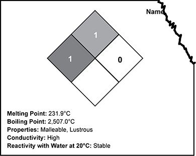 A diamond is subdivided into four smaller diamonds. The left, smaller diamond is dark gray and contains a 1. The top, smaller diamond is medium gray and contains a 1. The right, smaller diamond is light gray and contains a 0. The bottom, smaller diamond is white. Below the diamond is listed Melting Point 231.9 degrees Celsius, boiling point 2507 degrees Celsius, properties malleable and lustrous, conductivity high, and reactivity with water at 20 degrees Celsius stable.