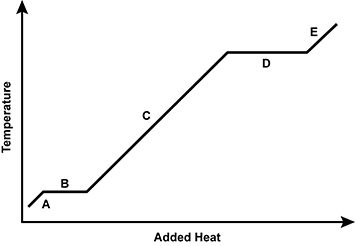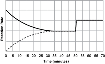 An x y axis is shown with the x axis labeled reaction progress and the y axis labeled potential energy. A horizontal line extends from reaction progress equals 0. The distance between the line and the x axis is labeled a. The line increases to a peak. The vertical distance between the horizontal segment of the line and its peak is labeled b. The distance between the peak and the x axis is labeled c. The line decreases before becoming horizontal again, at a lower level than the first horizontal section. The distance between the second horizontal section and the x axis is labeled d.