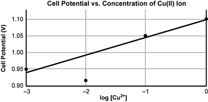 Copper and zinc can undergo an electrochemical reaction according to the chemical equation shown. Cell potential (in volts) is measured during an experiment in which C u 2 + concentration is varied. Zn 2+ concentration is held relatively constant during these trials by reacting far more zinc than copper. The table represents these experimental data. The graph summarizes the relationship between copper ion concentration and cell potential.