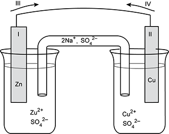 Two beakers are shown, connected by a salt bridge, on which the left side is labeled 2 N a + and the right side labeled S O 4 2 minus. The left beaker contains a solution labeled with Z u 2 + and S O 4 2 minus. An electrode labeled 1 and Z n extends up to a semicircular wire. An arrow labeled 3 points to the right. At the other end of the wire, an arrow labeled 4 points left. An electrode labeled 2 and Cu extends down into the right beaker, which contains a solution labeled C U 2 + and S O 4 2 minus.