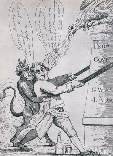 14 MAD TOM IN A RAGE. Federalist cartoon depicting Jefferson as a brandy-soaked anarchist tearing down the pillars of government. Ca. 1795 to 1809. Photo credit: Everett Collection / Bridgeman Images.