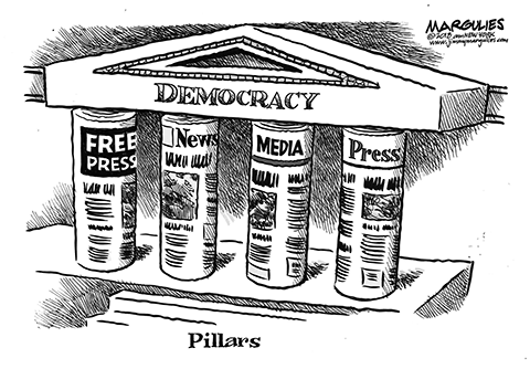 A political cartoon with the title, Pillars, at the bottom. A classical-Greek style edifice labeled, Democracy, rests upon four pillars resembling giant rolled-up newspapers. The columns are labeled, Free Press, News, Media, and Press.
