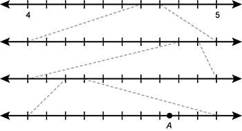 A number line is shown with a minimum of 4 and a maximum of 5. The space between the 4 and 5 is divided into tenths using tick marks. Dotted lines extend from the 6th and 7th tick marks down to the ends of a second number line, which is also divided into tenths. Dotted lines extend from the 7th and 8th tick marks of the second number line down to the ends of a third number line that is also divided into tenths. Dotted lines extend from the 3rd and fourth tick marks of the third number line down to a final number line that is also divided into tenths. The point A is located halfway between the 7th and 8th tick marks on the final number line.