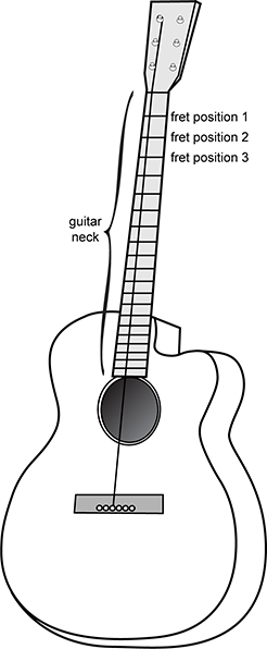 A guitar is shown with a single string attached to connectors above its neck and in the middle of its body. A series of horizontal lines along the neck of the guitar represent frets. The first fret from the top part of the neck is labeled fret position 1. The next 2 frets that follow are labeled fret position 2 and fret position 3.