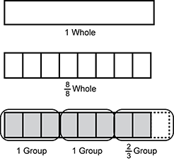 A rectangular bar is shown which represents 1 whole. Below it, the bar is divided into 8 equal sections using vertical lines to indicate a value of 1 whole in the form of 8 over 8. Below that, the same bar shows three circles that divide the eighths into groups of 3. Below each complete group of 2 is the text "1 group", while under the incomplete group of 2 is written "2 thirds of a group."